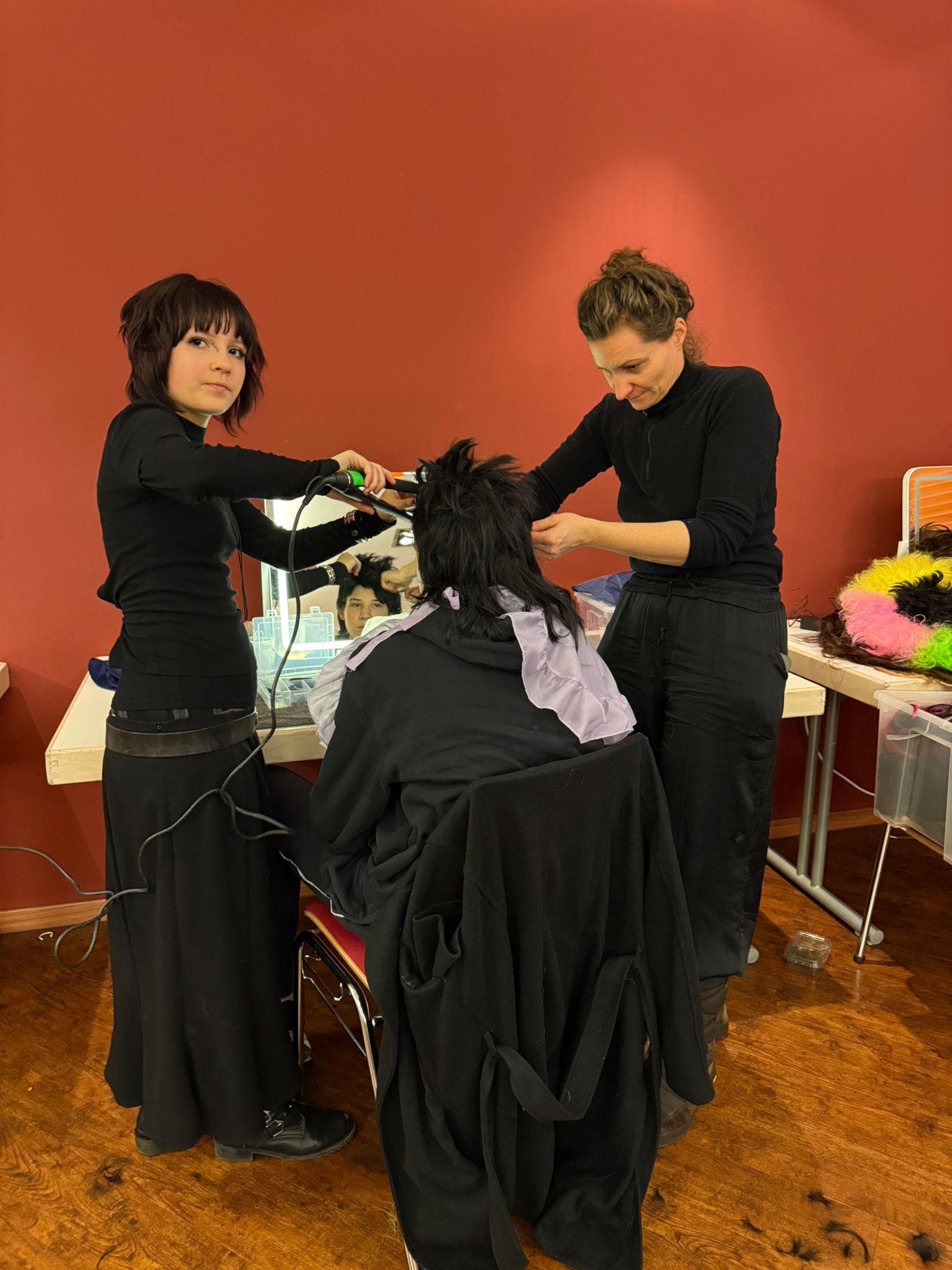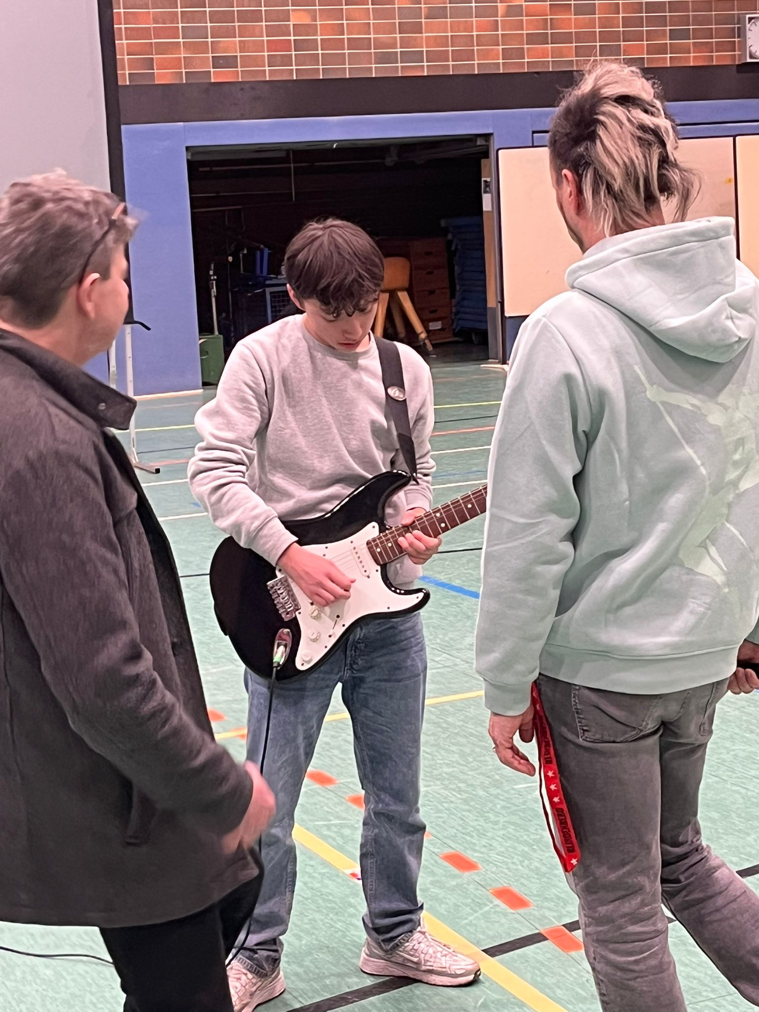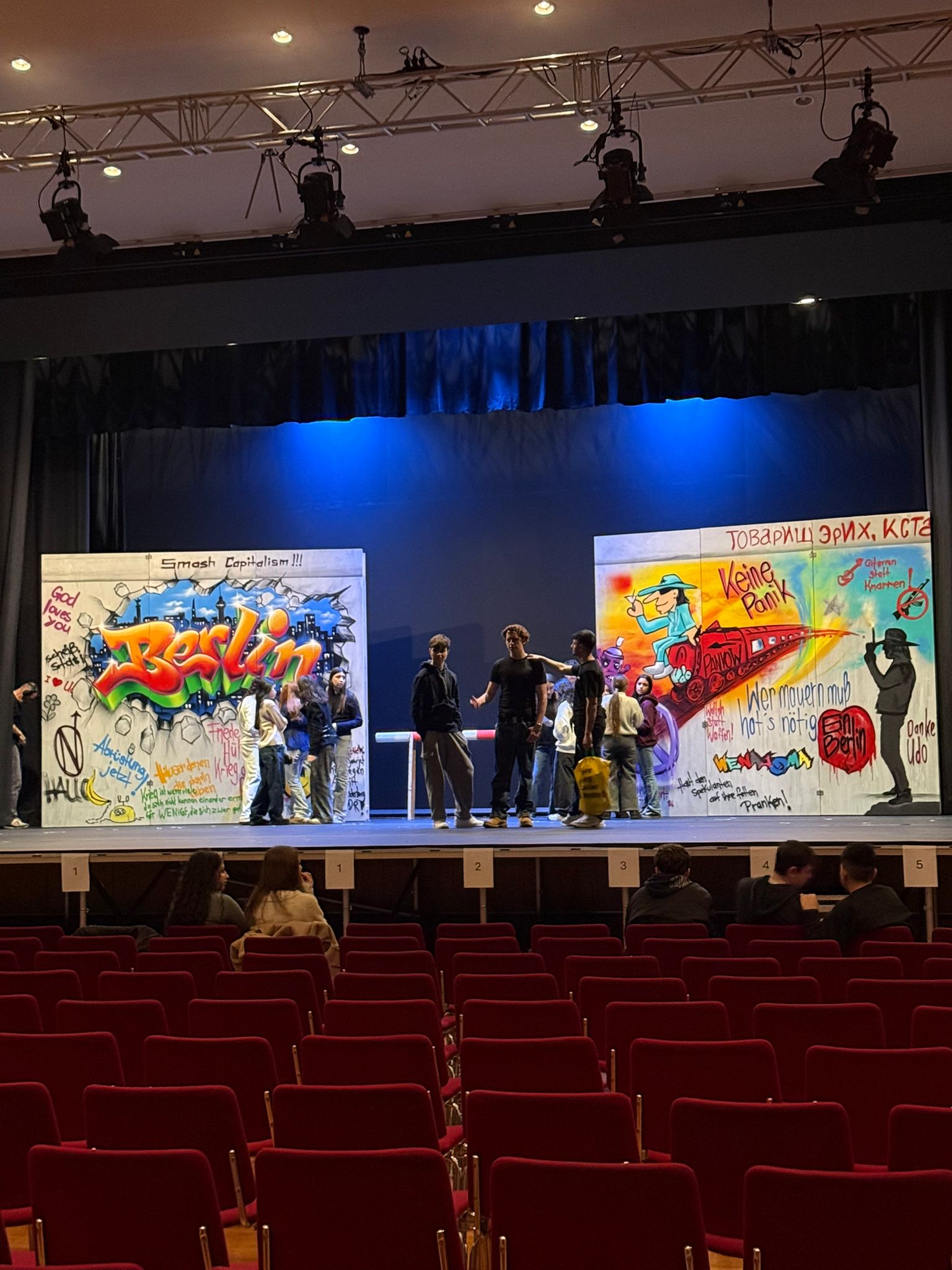 Die Schülerinnen und Schüler der Theodor-Heuss- und Goetheschule proben gemeinsam mit einem Team der Udo Lindenberg Stiftung auf der Bühne der Stadthalle Limburg für die Aufführung im März.